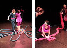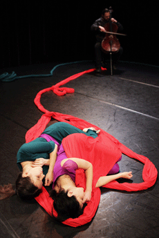 Es ist da und zugleich nicht da. Eine kleine Seele am Beginn des Lebens. Eingerollt und zufrieden. Und das lange Band? Die Riesenschnur? Wo führt sie hin? Ein Stück für zwei Tänzerinnen und einen Cellisten.